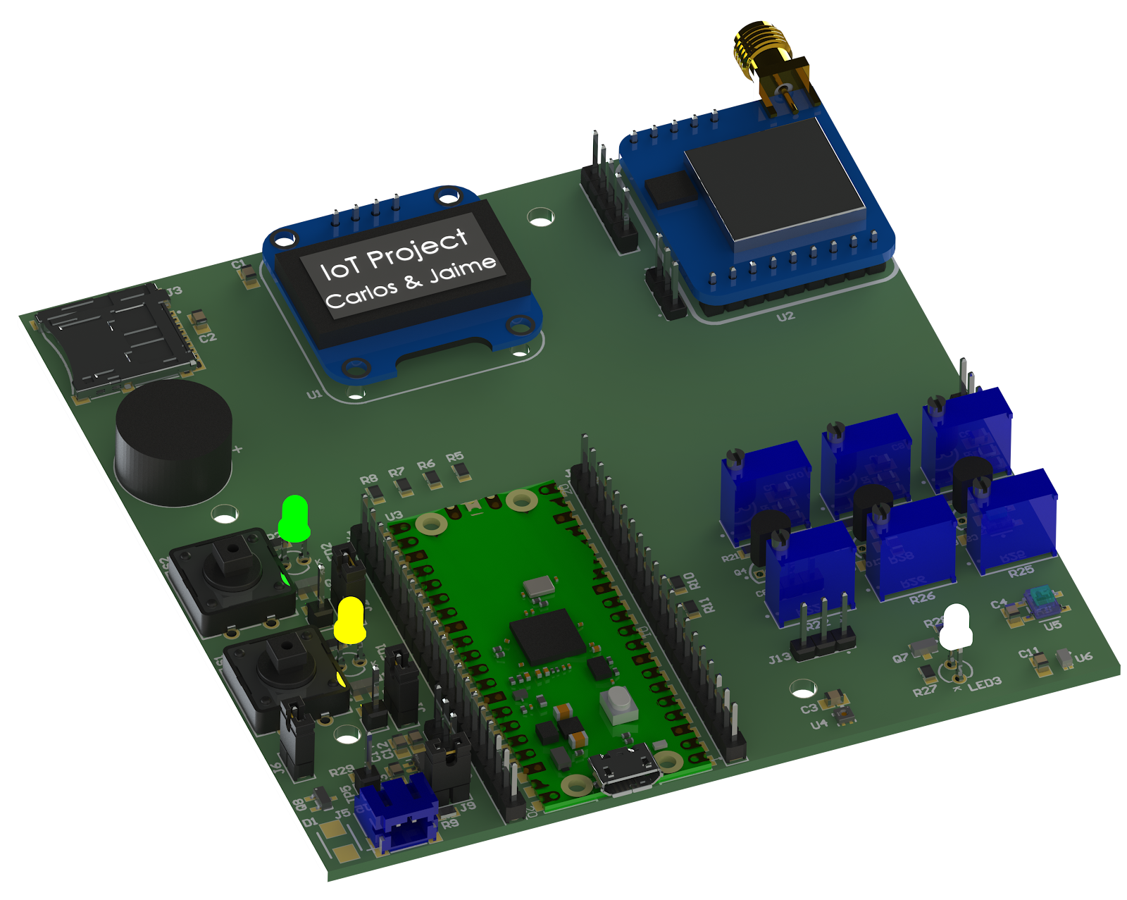 Diseño en Altium Designer  de la tarjeta electrónica que incluye todos los componentes, entre los que se encuentran un módulo de microSD y un conector miniUSB para inyectar la alimentación.